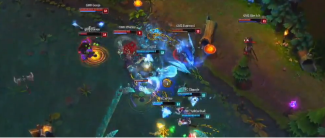 In a fight around Dragon at 22 minutes, sOAZ demonstrates the power and utility that a well played Trundle can offer a team. Sitting in the river bush, sOAZ completely zones out Diamond, Genja and EdWard while the rest of Fnatic crushes Darien, who bravely charged into the fight. A Pillar of Ice keeps Genja too far away to help his tank, and by the time Diamond Shyvana ultimates past sOAZ Darien has been forced to Flash away at low health. With Diamond now the center of attention, sOAZ uses his ultimate to greatly reduce Shyvana’s natural tankyness, and Fnatic eliminates Diamond before he has time to deal too much damage.