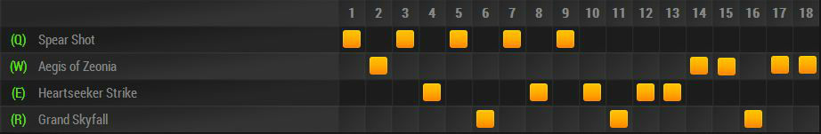 Maxing Spear Shot is always top priority. Not only does this help you clear the camps faster, but it deals tremendous amounts of burst damage when ganking. It also serves as a great finisher when the opponent flashes away, due to its decent range. Since Aegis of Zeonia's stun duration is the same at all levels, Heartseeker Strike is a next one of max out.