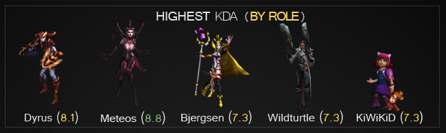 When sorted by role, there is hardly any change involved in this week's stats. Dyrus brought his KDA up to 8.1, almost rivaling Metos at 8.8, who still retains the highest KDA in the lead despite Cloud 9's epic loss to Team Solomid last weekend. KiWiKiD continues to hold the highest KDA for a support, shocking all who witnessed his top lane KDA stats last season first hand.