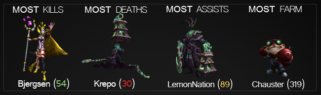 To nobody's surprise, Bjergsen retains his spot as Bjerger "king" in the mid lane, hiking up his total kills to 54 from his previous 46. Krepo continues to be the "king of feeding" by having a total of 30 deaths in his initiation attempts for the team.