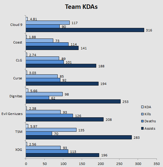 As expected, Team Solomid's KDA went up slightly this week, rising up from a 5.37 to 5.97, while Cloud 9's faltered very slightly. Counter Logic Gaming saw a rather significant .5 increases from their previous values, now sitting at 2.74 with HotshotGG no longer there as a focus target and Chauster filling in for the middle lane.
