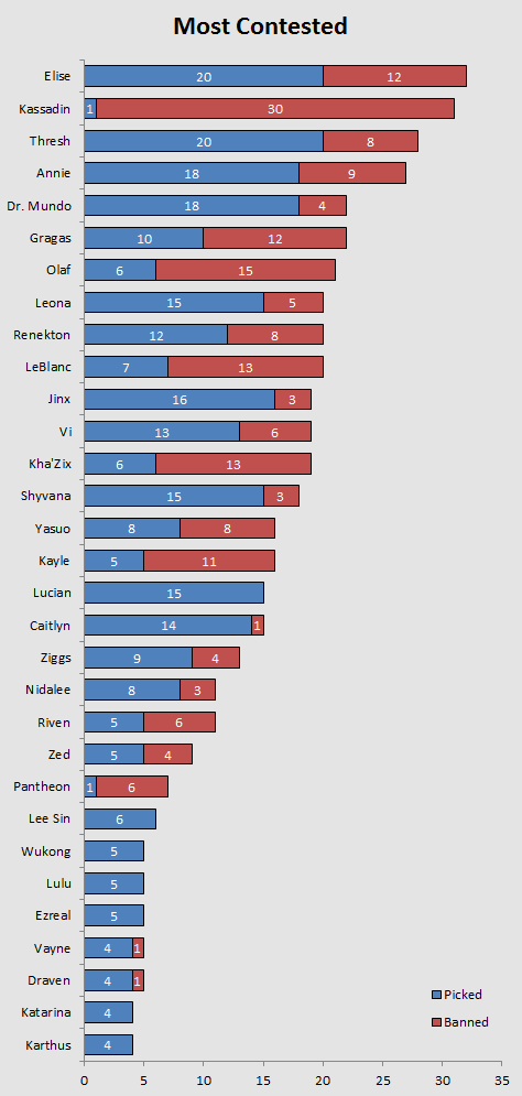 - Only Elise has a 100% pick and ban rate with 20 picks and 12 bans. Kassadin has been played once and has 30 bans.