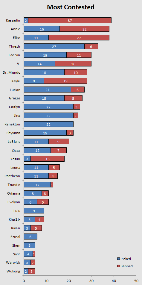 Kassadin finally took the lead over Annie and Elise in most contested, as Annie and Elise each escaped a game without being picked or banned this week. Lucian overtook Jinx in popularity again, and Renekton finally beat out Shyvana. Kayle beat out both Ziggs and Gragas as the queen of mid lane—in terms of mid laners who actually occasionally make it through ban phase.