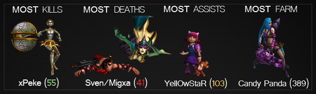 Having managed to stay alive for most of SK Gaming's single match this week, Svenskeren has finally managed to pick up an equal in most deaths. He and SUPA HOT CREW's Migxa have both died 41 times throughout these past four weeks, even with the recent gains made by their respective teams in standings. Meanwhile, Candy Panda has managed to push Rekkles off the board for highest average farm once again by picking up a new favorite champion, Jinx, and maintaining a solid 389 creep score per game.