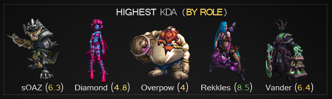 As Fnatic now shares first place with Gambit Gaming and ROCCAT, sOAZ and Rekkles also share best KDA by role with members from the other two top teams. Overpow retains his lead as king of the mid lane KDA from last week at 4.0, the lowest on the board, but his teammate, Vander, has ousted YellOwStaR, despite the Annie player's firm claim on the most assists title, with a respectable 6.4, simply for dying less.