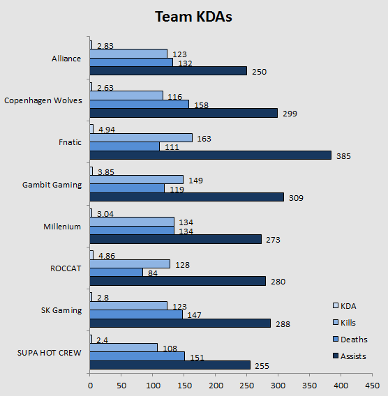 Fnatic still leads the league with a KDA of 4.94, but ROCCAT just barely lags behind at 4.86 after chinks in the leading team's armor were exposed. Though Fnatic have died more this week, they still lead the league in assists at 385 and kills at 163.