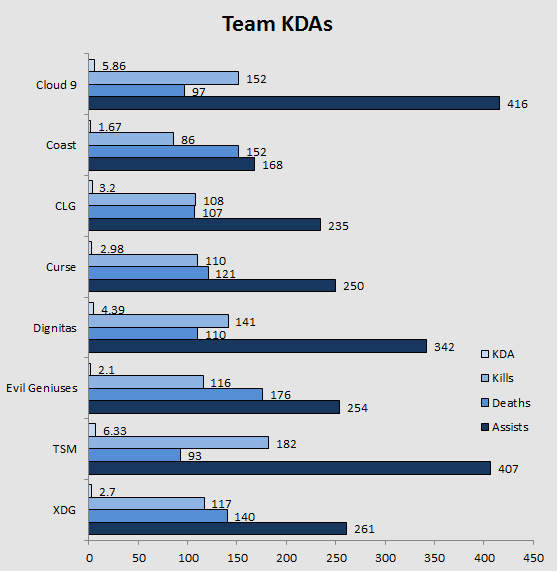 Cloud 9 has crawled even higher this week with a KDA of 5.86 over their last week KDA of 4.81. Counter Logic Gaming's KDA is also on the rise after the debut of their full roster this week, finally pulling above that 3.0 mark. However, the reigning team also has a KDA reflecting of it. Team Solomid have improved their KDA from 5.97 up to 6.33, which trumps Europe's equivalent, Fnatic, who's KDA is 4.94.