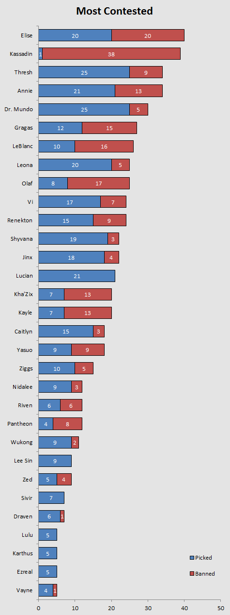 Elise and Kassadin have both received a mountain of bans this week with the next ten or so champion picks remain roughly the same with a few champions switching spots with the champion right above them or below them. The most contested champions have grown stale, which is to be expected on the same patch for so long after all. Hopefully, this will be remedied by the latest patch hitting the tournament realm.