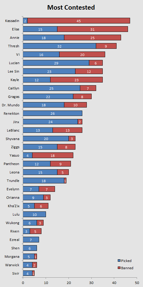 Kassadin has officialy hit 45 bans in the European LCS, still only being allowed to slip through thrice, of which one of those games neither team picked nor banned him. While the current meta has stagnated and a lot of popular champions consistently see play, we've seen Dr. Mundo fall down on the charts a bit in comparison to prior weeks.