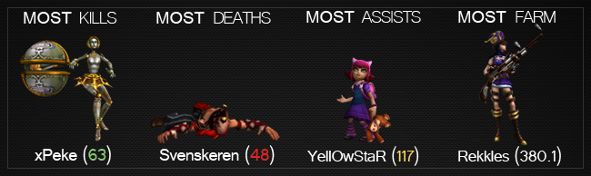 Fnatic's performance may be going downhill, but they are still performing individually well in several areas. xPeke, YellOwStaR, and Rekkles all retain their positions for top Kills, Assists, and Farm respectively. Svenskeren now takes the sole position of "biggest feeder" away from Migxa who tied him last week.