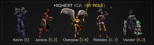 Overpow, Vander, and Rekkles retain their spots in the top KDA for their roles, albeit all three of them dropping off a bit in terms of actual quantity. With Europe slowly becoming closer and closer, it's expected that players wouldn't be so strictly dominant and, naturally, some numbers have fallen off.