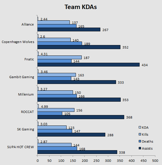 KDA levels for the team aren't a massive difference from the previous week, though it's worth noting that Gambit Gaming and Fnatic's KDA fell off a bit more than ROCCAT's, who's stagnated. SK Gaming managed to accomplish an above 3.0 average KDA this week, which marks the first time for them since the start of the split.