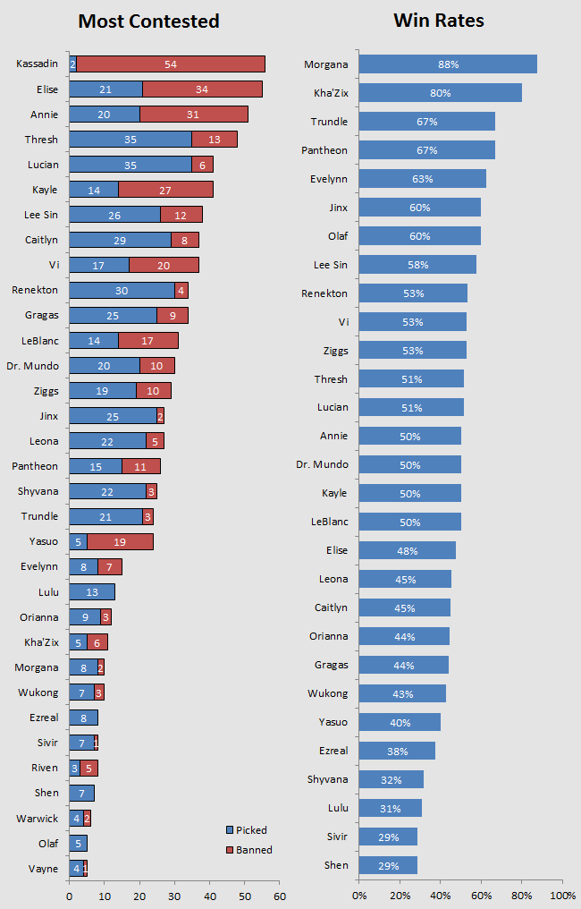 Vayne joined the list of most contested picks, largely due to CandyPanda's success. Leona's popularity rises with seven picks this week. In addition, Lulu has become the only champion picked ten or more times without receiving a ban now that Renekton has received four.