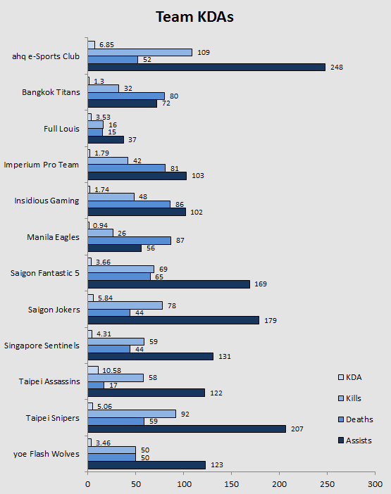 Demolishing both the Saigon Fantastic Five and the Manila Eagles last week, Taipei Assassins claim the KDA throne for now with 10.58. This is even more impressive considering the the 2nd spot, is trailing by 4.33. However, in terms of bloodthrist, ahq still reigns supreme, adding 48 more kills to last week, totalling to 108, as well as 110 more assists, adding it up to 248.
