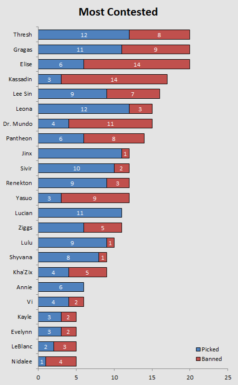 Kassadin and Elise are still most banned, and Thresh and Gragas are still as hotly contested as the previous week. Dr. Mundo is also slowly becoming a priority pick, as he is now the 2nd most banned, and the 7th most contested pick, a leap from last week's 12th. Another interesting trend is sudden fall-off of Ziggs. It seems that SEA team are preferring another Yordle, Lulu. From zero in Week 1, she was suddenly picked 9 times and banned once. Her strong utility that scales into the late game well it most likely the reason for her popularity, similar to what the other regions are leaning to.