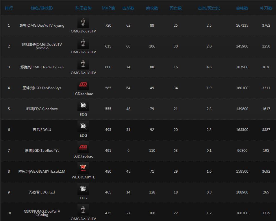 MVP Score / Kills / Assists / Deaths / KDA / Gold / CS