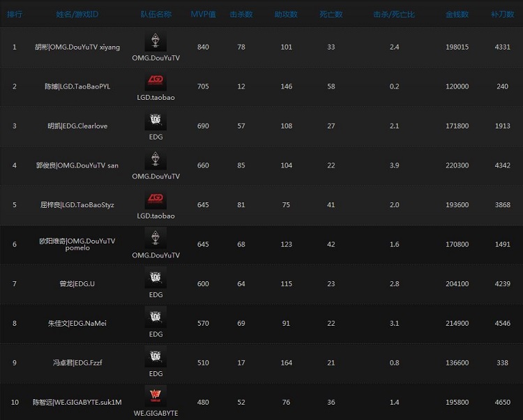 MVP Score / Kills / Assists / Deaths / KDA / Gold / CS