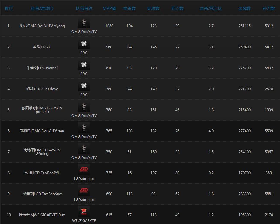 MVP Score / Kills / Assists / Deaths / KDA / Gold / CS