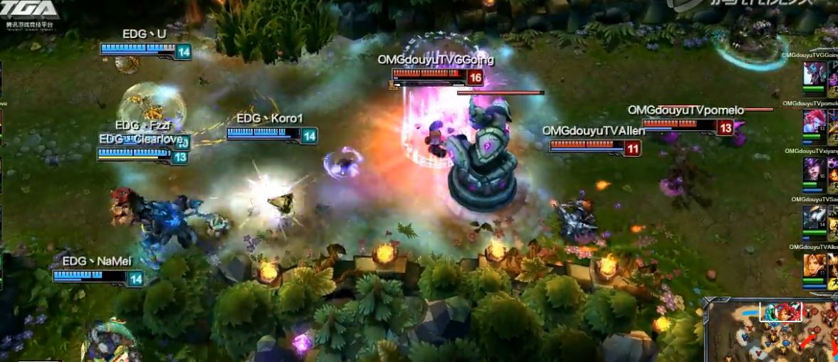 OMG started pulling ahead in fights when dragon was being contested, mostly due to superior zoning control and superior AoE. EDG tried pushing to compliment their mid game strength, but OMG's wave clear was strong and again they dominated in map vision, which allowed them to find flanks in fights.