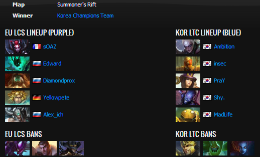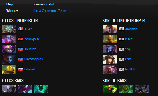Korea came out on top at every corner between dragons, towers, barons, and kills. One player who did noteably well was Yellowpete with Ezreal, who was able to kite away from many of the threats the Koreans brought to the table, but just didn't have enough damage output compared to the raw damage and tankiness OGN was able to muster off their heavy gold lead. Europe would eventually go to lose the game, playing North America in the Loser's Bracket tomorrow at 09:00 CET.