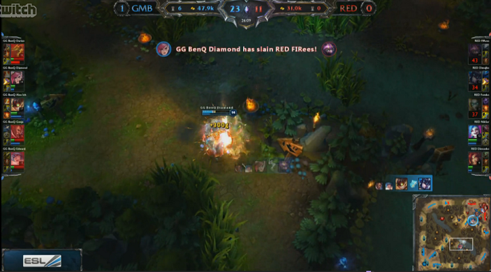 In the first game, both Gambit and The RED swapped bottom and top lane. The fighting began almost immediately with Darien and FIRees trading summoner spells. First blood, however, was achieved when Alex got the drop on Fomko's unconventional Quinn pick, and Gambit secured the first dragon. The RED proceeded to focus a lot of attention on Darien, securing kills for FIRees' Shyvana and Fomko's Quinn, who roamed bottom. Despite Gambit taking advantages in other parts of the map, this strategy gave The RED the first tower and kept them in the game. The game first began to move into Gambit's favor when The RED attempted to initiate a dragon fight, and Edward caught them in a Tibbers ultimate with his Annie, resulting in a three to zero victory for his team. At this point, Diamond used The RED's top lane focus to his advantage by repeatedly ganking his bottom lane to snowball Genja. Gambit were comfortable with the strategy, as it has been said that, when Darien feeds, Gambit wins.