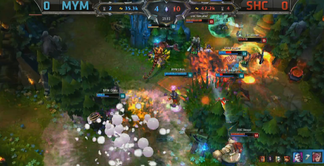 A brief catch on Moopz in the mid lane later gave MYM a short-lived window in which they took both mid lane outer turrets. As soon as Moopz respawned, however, SUPA HOT CREW XD regained control and won the next fight handily, taking the game.