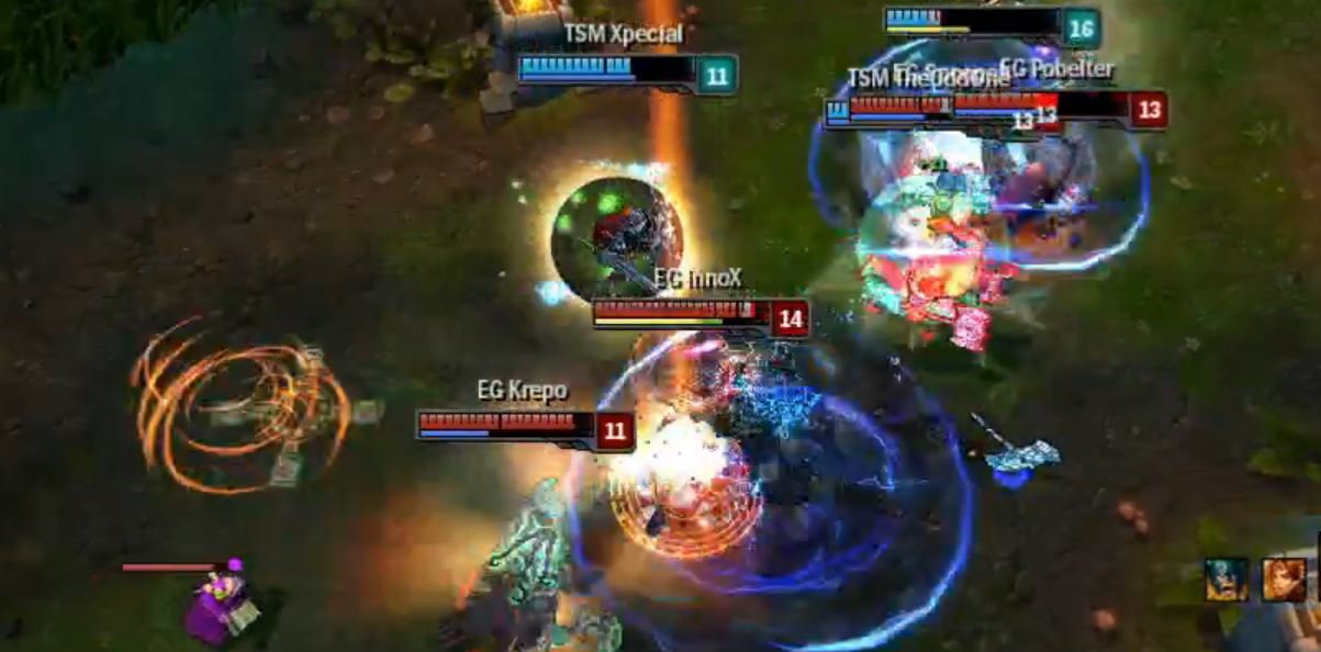 TSM battled against Evil Geniuses with a very scary initation composition, backed by Sivir's speed buff and very threatening bruisers. A very early first blood went down onto Innox only 4 minutes in from a duo dive from Dyrus and TheOddOne. A countertgank from Snoopeh bottom allowed Evil Geniuses to nearly even the odds. An early dragon would allow Evil Geniuses to stay in the game.
