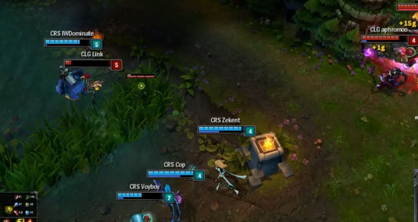 The rivaled rematch between the two teams kicked off immediately with CLG finding a vision advantage due to Aphromoo finding a pink ward before the start of the laning phase. Cop's Jinx was incredibly strong with double steroids and was able to shove the top towers very hard with his team, creating an early vulnerable inhibitor. Doublelift and Aphromoo took the bottom lane tower almost equally as fast in the beginning.