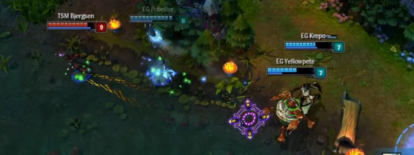 At the start of Team Solomid vs. Evil Geniuses, EG attempted a run once again at their infamous Urgot Soraka lane. Unfortunately for them, they only really went even with TSM's bottom lane, but did manage to get first blood onto Bjergsen's Leblanc in the early game. Bjergsen quickly came back and got a kill of his own. SNoopeh was able to keep the score even despite a farm deficit by Snoopeh's influence on the game.