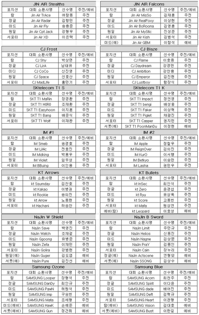 Most noteably, perhaps, are the placements of Helios as the starting jungler for Najin Black Sword while ActScene is listed as a substitute, and dade as mid laner on Samsung Blue with PawN on Ozone. These are likely trial placements to see how teams perform with these changes.
