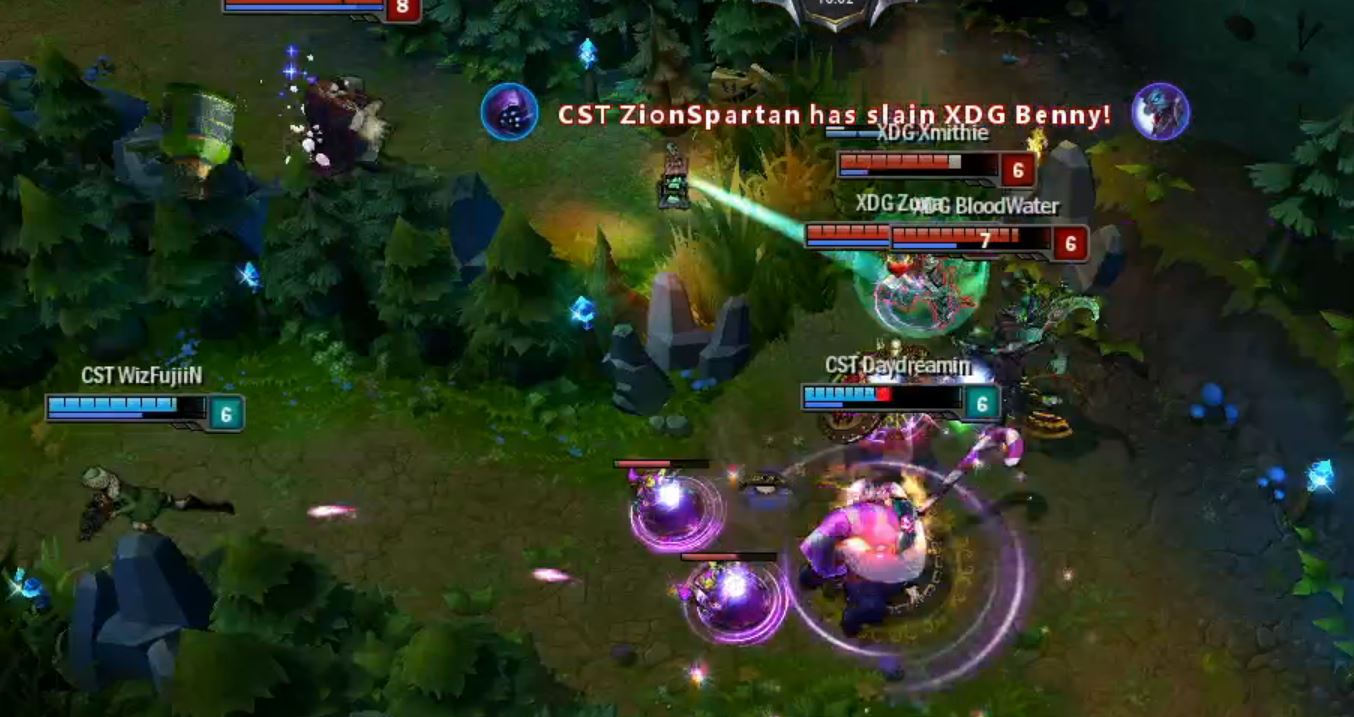 XDG instantly started out with the early disadvantage due to giving Zuna a lot of help in the jungle. This resulted in an earlier level two for Coast's already strong lane of Caitlyn and Lulu. Coast quickly snowballed a medium lead over XDG, staying a constant 1k gold ahead. Zionspatan was showing his strengths playing a carry champion rather than a super tank.