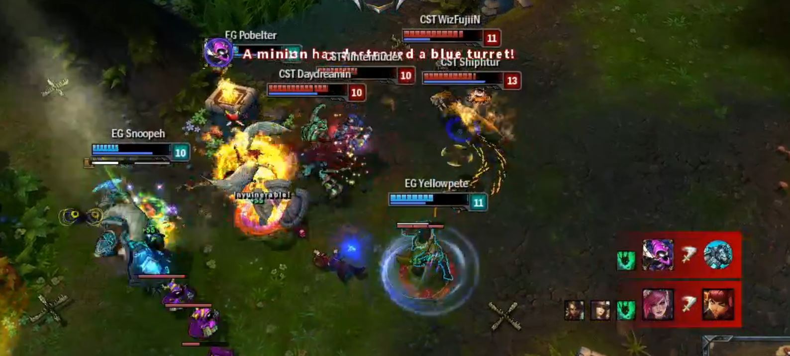 In the oldest rivalry in the books for competitive League of Legends, both teams were playing safe in a way that displayed that neither wanted to throw an early lead. TSM played the defensive role properly while Dexter tried to lead his team aggressively into TSM's jungle. With a teleport from Dyrus, TSM were able to take the first turret, but Nien was able to take top tower. First blood went down at 12 minutes for Nien top and CLG started having a small advantage.
