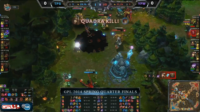 The first game started snowballing in the Flash Wolves' favor when they used the 2v1 swap to three man gank Zonda's vulnerable Dr. Mundo. Once down, Zonda immediately teleported back in and gave the Wolves a second kill, off which they took the first dragon. The situation only grew worse for TPS at subsequent fights around dragon and in the top lane, in which NL picked up a quadrakill.