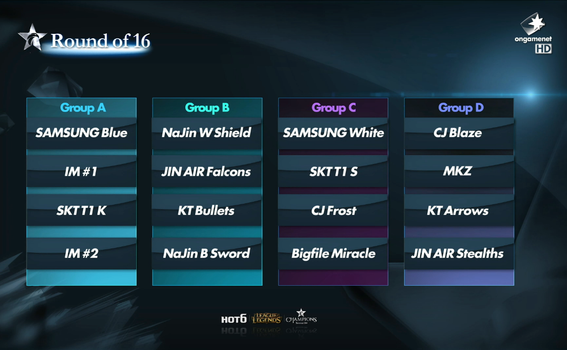 With the conclusion of the qualifiers being set, all groups are announced. Groups A and B have created teamkill situations for both the IM and Najin organizations. Both Incredible Miracle teams will also have to contend with former OGN Champions SKT T1 K and most recent OGN Champions Samsung Galaxy Blue. The groups are as follows:
