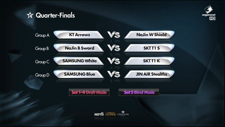 As all groups of Round of 16 were finished, OGN and representatives of each advancing team have immediately carried on deciding their groups for Round of 8 in OGN Summer 2014. It is noticeable that Samsung White and SKT K are battling each other once again in Round of 8.