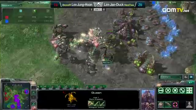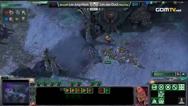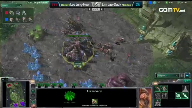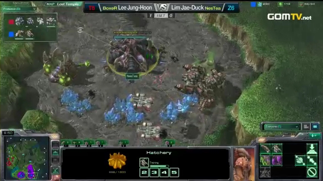 | The game begins with BoxeR applying a bit of pressure on NesTea by building a Bunker at NesTea's ramp. This would draw a few mining Drones away from NesTea's base while BoxeR expanded to his natural. NesTea had also decided to expand to his natural and at first it seemed like both players would opt for a long game, but BoxeR had other plans. BoxeR would move out with just eight Marines and head straight into NesTea's base trying to deal as much damage as he could, but this was a disastrous mistake as NesTea had a large group of Zerglings already produced that just ripped BoxeR's Marines to shreds. At this point there was no stopping NesTea from simply just pummeling his way into BoxeR's base with his Zerglings. At one point NesTea had even cancelled several Banelings that were morphing, realizing that all he needed were several more Zerglings to finish the job. BoxeR, once again showing very poor judgment in attacking at the most inopportune times. Akin to the first Marine push that he had in the game on Jungle Basin, this push was far worst as he had no back up or contingency plan had the Marine push failed. | ||||||||||||||||||||||||