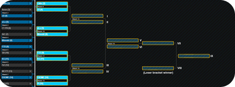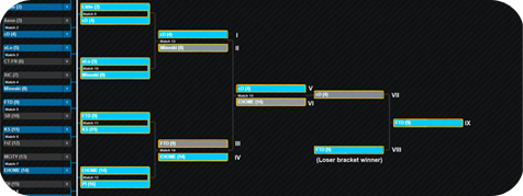 Similar to the sample bracket, the GosuGamers coverage bracket for SMM 2010 will provide the team codes for all teams involved as a number following the team name. The highlighted slots labelled I-IX represent the slots participants will be required to fill in.