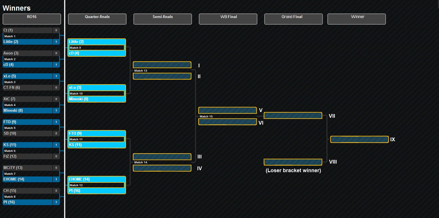 --Starting from the quarter finals, participants predict the results of the winners brackets. Participants also predict the winner of the losers bracket and the winner of the grand finals.