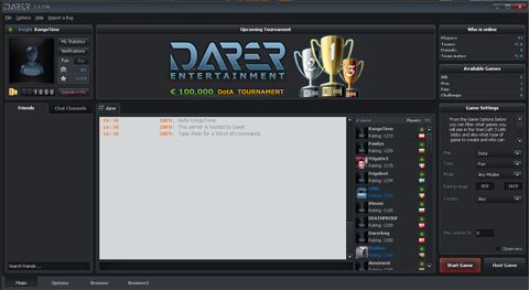 So much for the concept, but how far is Darer in terms of development? Once registered at the website, the client is available for download and the open beta is running. Similar to RGC and Garena, players log in at the client and find themselves in a lobby. Games are hosted directly by clicking the red Start-Game-button and reachable in Warcraft III's local area network. We experienced no lag in our test matches; a reconnection service is installed as well. Not working thus far is the statistic feature and depositing money, which is unavailable due to the beta phase.