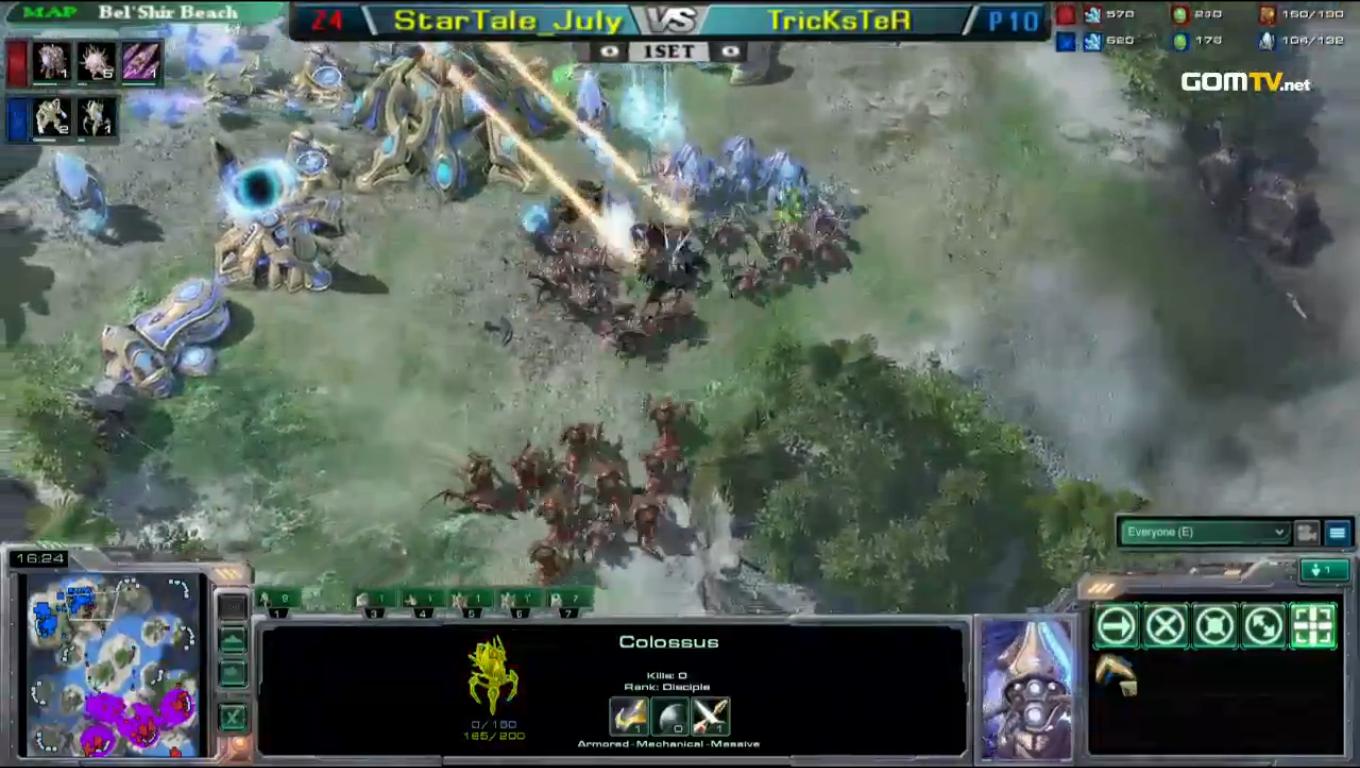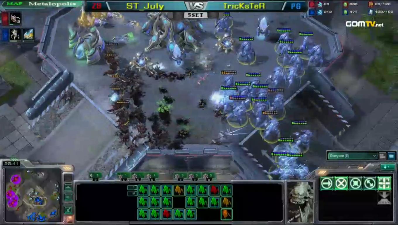 Trickster opened with a Stargate expand and after killing two Queens and some drones he followed it up with a 6-gate aggression. However, he would face a deadly resistance from July, who already had enough Hydras, Roaches and Lings to stall the protoss army. Later, a bad move-out from Trickster led to the destruction of his whole army and the game was July's