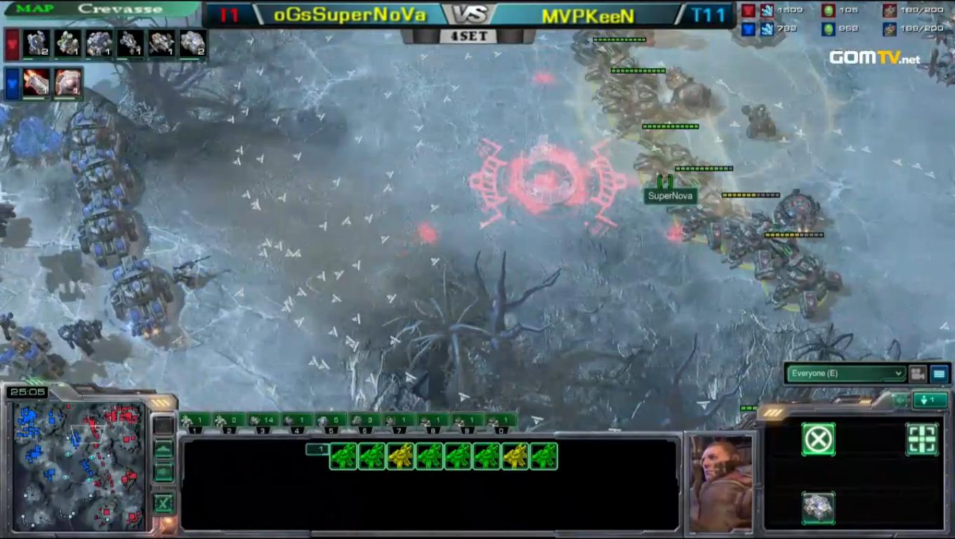 However, Supernova managed to find cracks in the contain and flew two CCs south, establishing a fourth and a fifth base - an essential move in order to support his expensive mech army. Keen tried to battle the ever-increasing tank numbers by using nukes but Supernova's banshees were ever watchful, sniping any ghost that posed a threat. Due to immaculate macro, Supernova soon got maxed and as Keen's supply withered under tank fire that game was over.