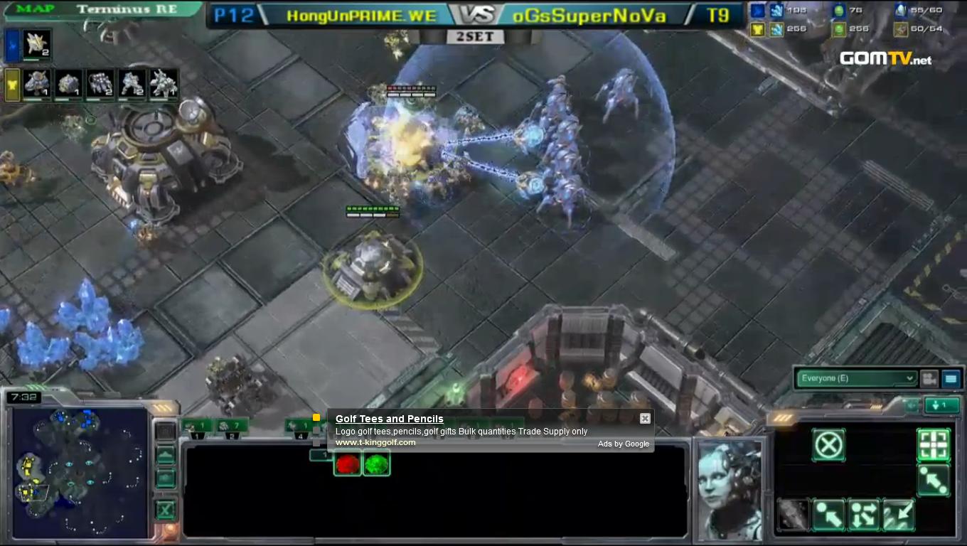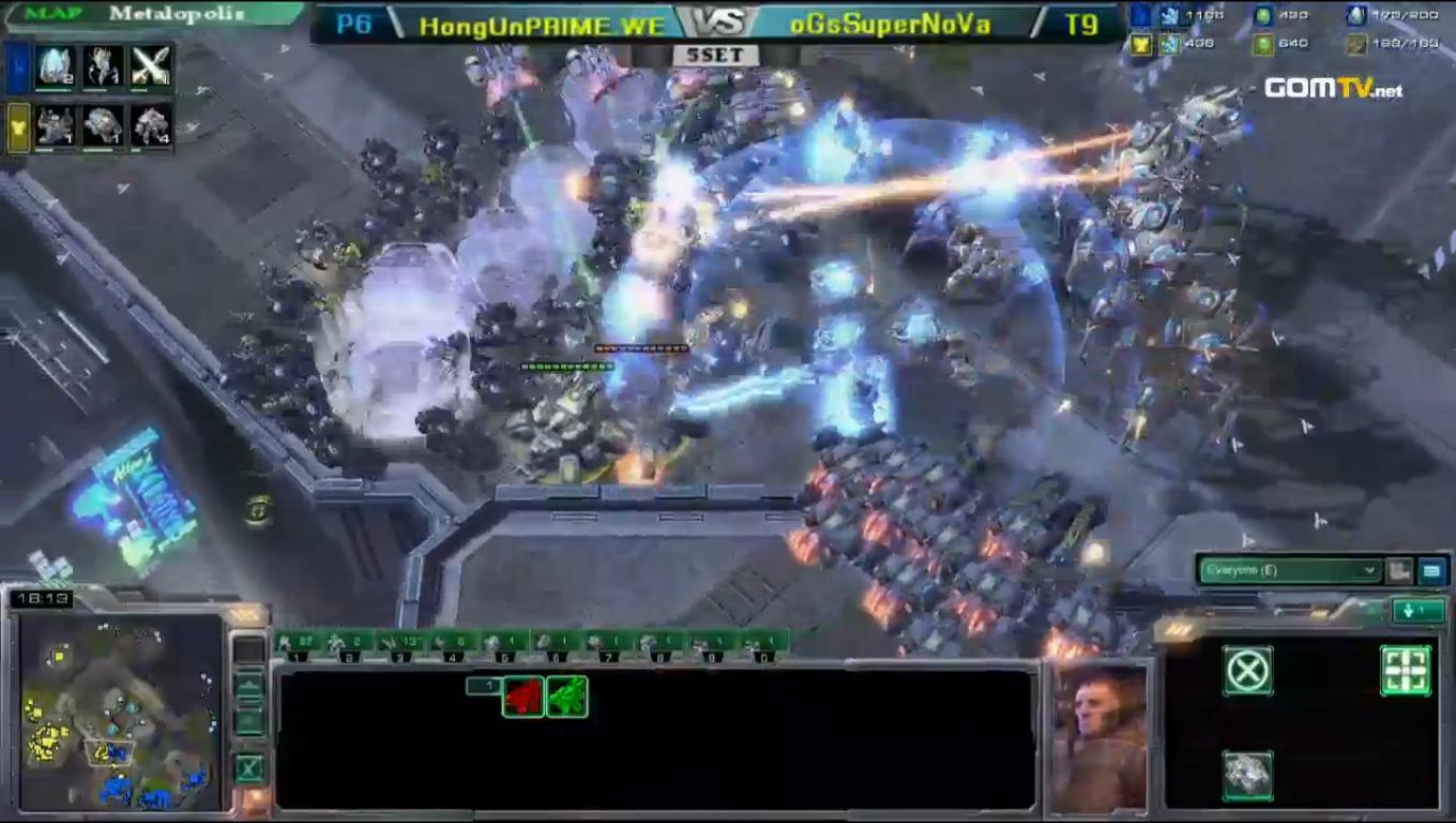 HongUn pulled a blitz victory, going for a 4-gate to counter Supernova's greedy 1-rax CC. A spot-on forcefield led to the destruction of one of the bunkers and although Supernova managed to get some tanks out, HongUn's force was just too large.
