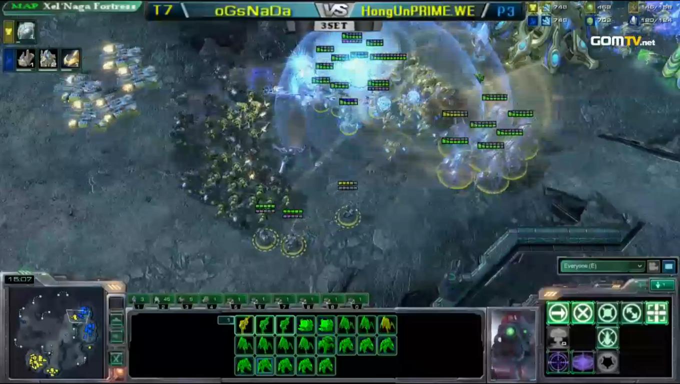 Nada opened with concussive shell rine/marauder push and forced a cancel on Hong's nexus but the sight of the high sentry count was a clue for the terran that he would not be able to advance further and so he fell back and took his natural. HongUn started the mass production of Immortals to counter Nada's marauders but the Genius Terran smartly mixed in some ghosts and after some perfectly placed EMPs, the protoss army became dust.