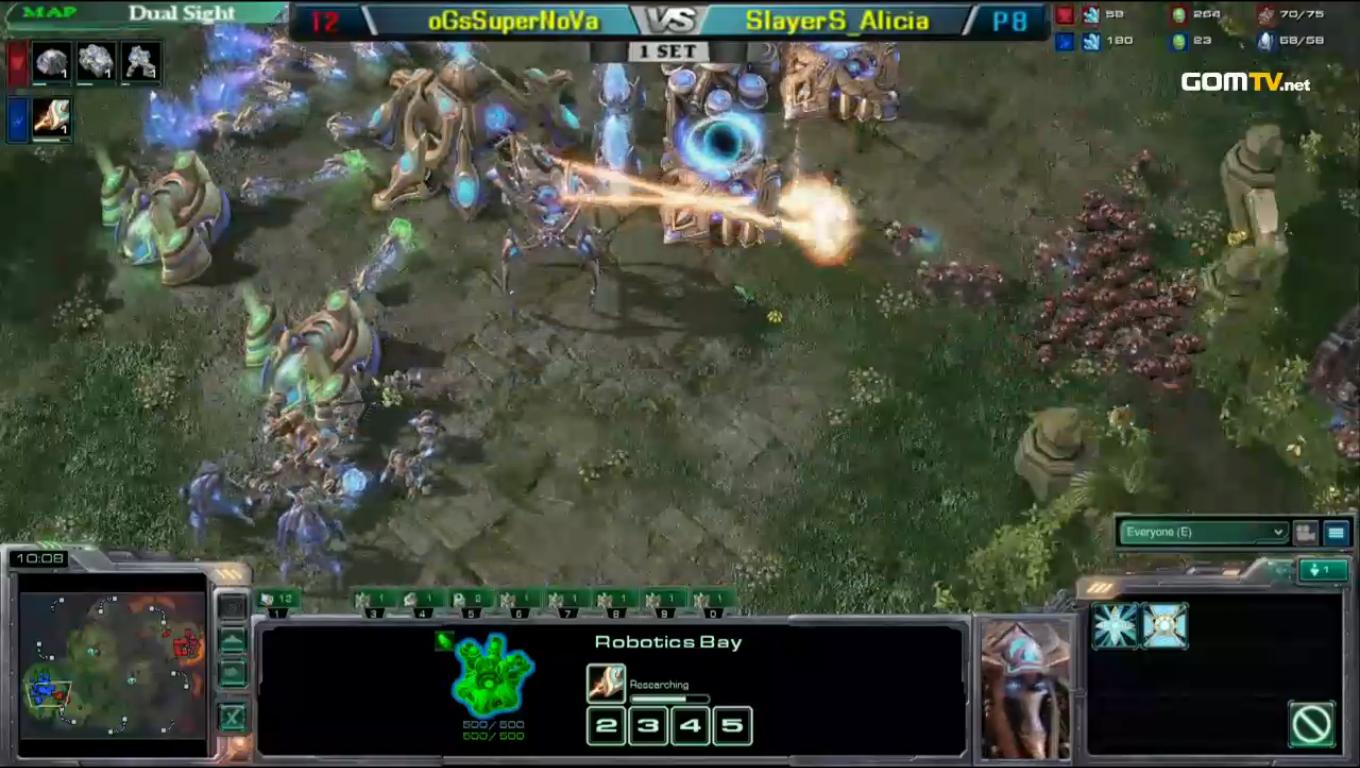 As Alicia threw down his fast expo and got his colossus tech under way, he moved out to do a poke with his immortals and gateway units. To his surprise, he was met with a 1-basing terran, gearing for a stim/tank push. Hesitation cost Alicia a precious immortal and the protoss found himself in a tough position. Although he managed to get a colossus out in time, Supernova's rush was too strong. The natural fell in seconds and as Supernova climbed the ramp it was a GG.