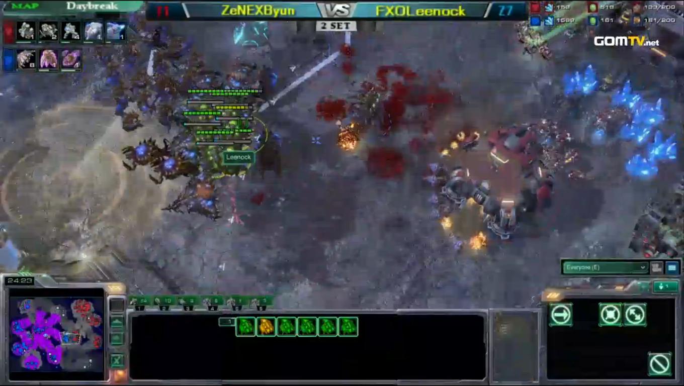 Leenock used his mutas to delay the second push that was directed at his top left base and so he got enough banelings in time to chase the terran away. With all the pressure off, the zerg just hit the macro button and exploded with devastating amount of brood lords that stormed Byun's lines of defense and forced a GG.
