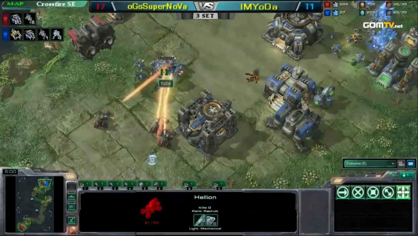 Supernova executed yet another perfect 1-base play, proxying a reactor factory and a starport at the expansion south of Yoda's natural. With hellions streaming in faster and by the bigger count, Yoda soon fell apart without even finishing his own starport. Supernova secured a quick 2-0 in his group.