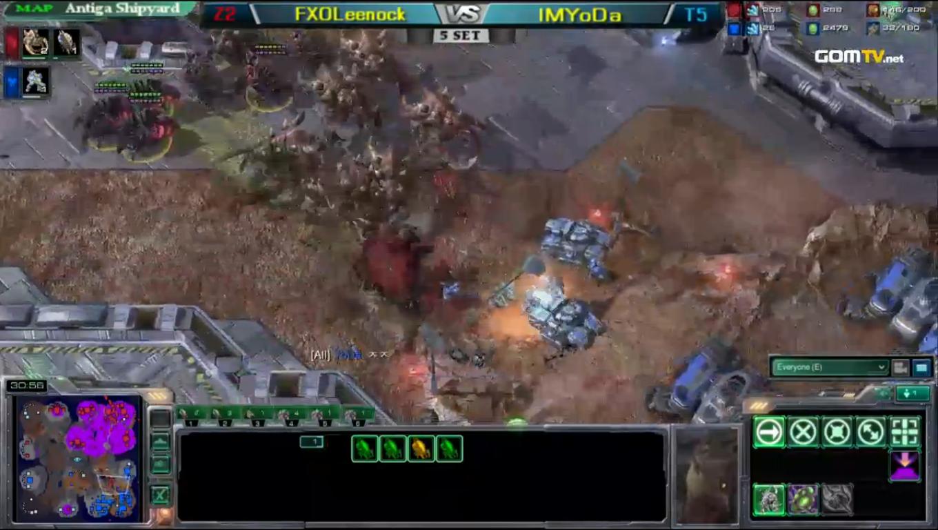 A very standard ZvT was played on Antiga between those two guys. Yoda started with early hellion pressure but only killed a couple of tumors before lings chased him away. The mid to late game was just Leenock trying to defend his gold expo (unsuccessfully) and fight to his best the constant marine drops with which Yoda constantly tormented him.