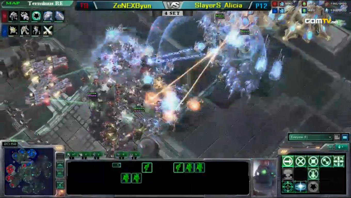 Alicia opened with a 2-base gateway aggression but as he was unable to break through Byun's bunkers he fell back and geared to take a third, teching to charge, blink and storm. As his tech kicked in, Alicia started winning the map control war, not allowing Byun to take a fourth and this staying a base ahead of his terran opponent. Byun attempted a big bio push but found Alicia's storms and colossi too big a bite to swallow. As Byun started his retreat, Alicia chased him down to get the victory.