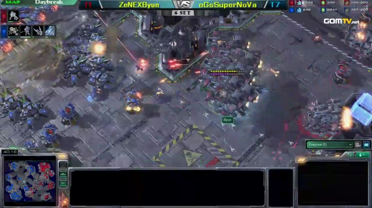 Byun had to do something and the decision was as simple as it was flawless. A quick tech switch to vikings and BCs caught Supernova a bit off guard and forced him to transition to mass starports as well, while Byun slowly regained the ground his lost. The air battles were long and tense with seeker missiles, thors, yamato cannons and multiple PDDs colouring the entire map. The game was heading towards a record length until Byun made the strange choice to land his vikings and storm Supernova's tank line.