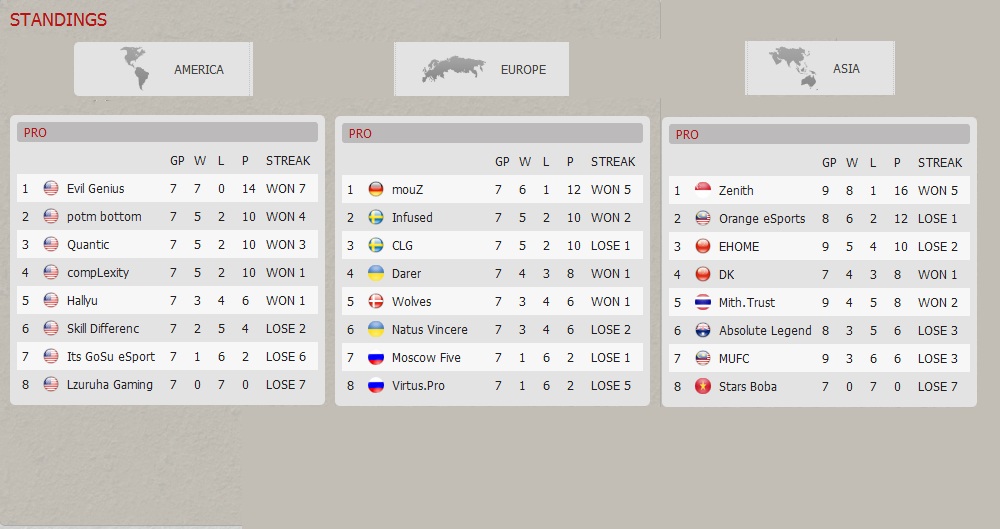 At the moment, the results aren't very surprising in the American and Asian divisions. If it were of any particular reference, the teams with invitations to The International make up the top rungs in the 2 categories.